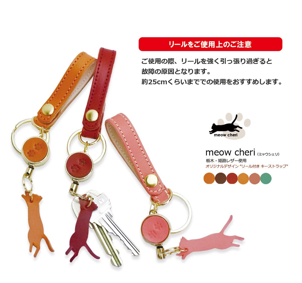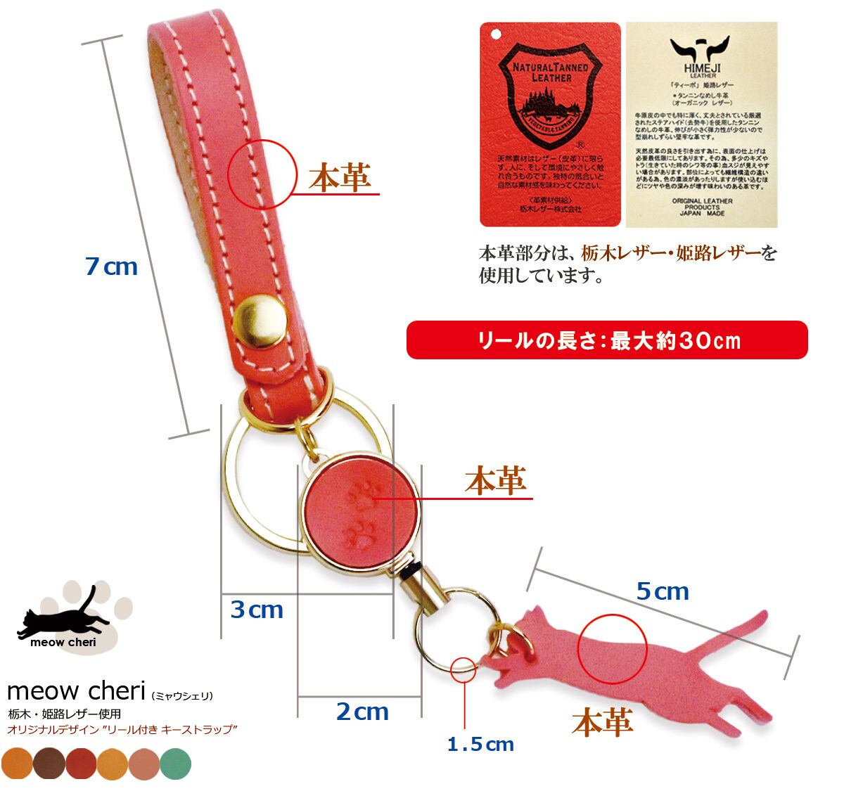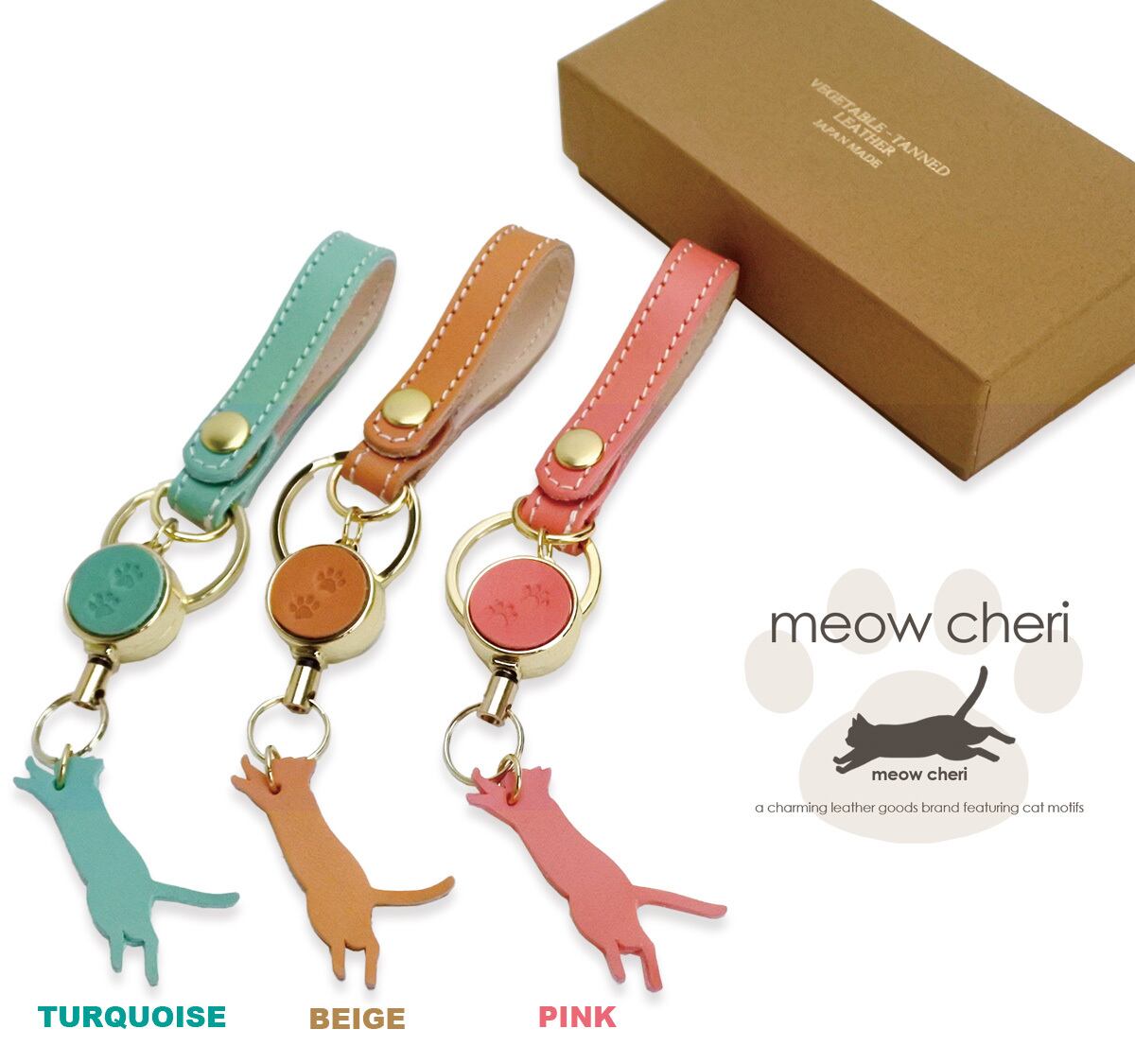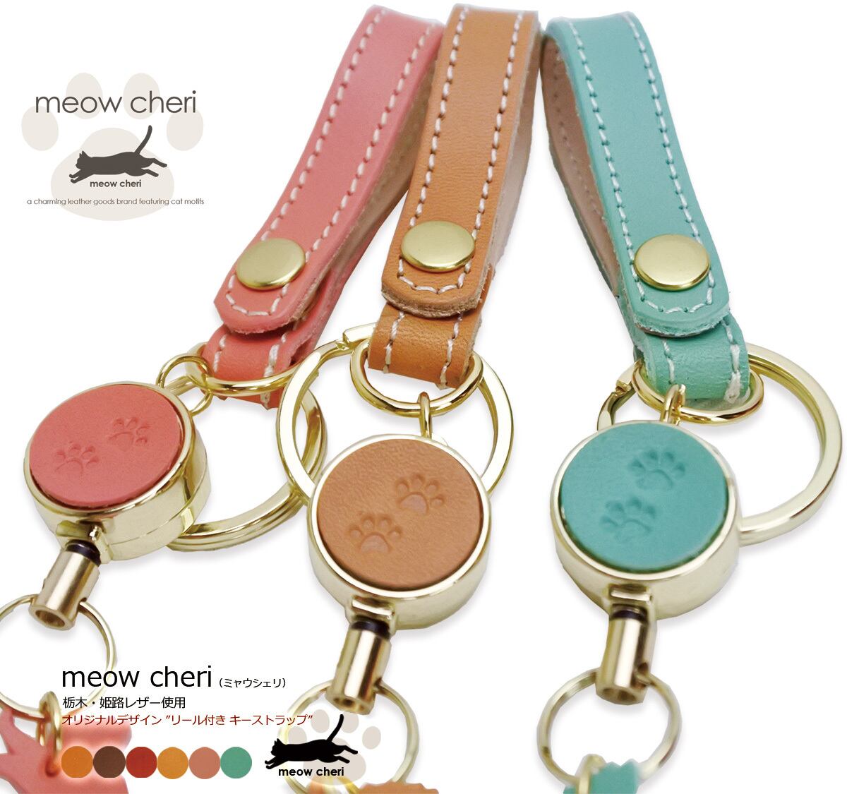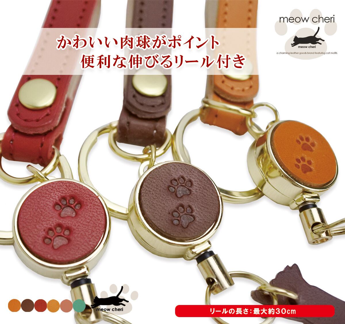 meow cheri 猫 キーホルダー 本革 リール付き ストラップ 栃木レザー 日本製 レディース ギフト プレゼント ねこグッズ バッグチャーム 肉球チャーム付き かわいい 大人可愛い 猫雑貨