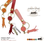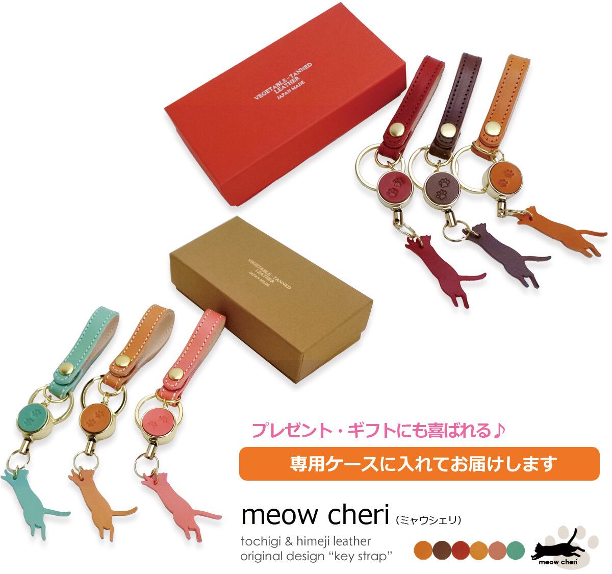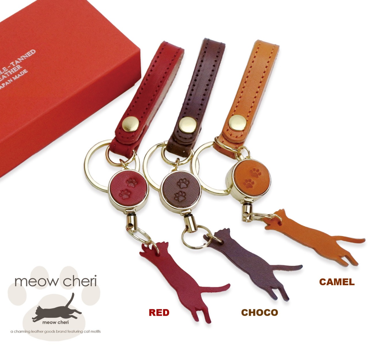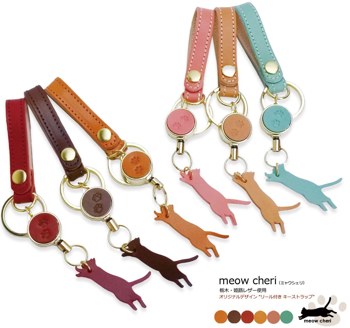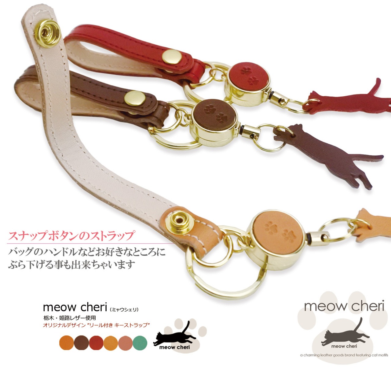 meow cheri 猫 キーホルダー 本革 リール付き ストラップ 栃木レザー 日本製 レディース ギフト プレゼント ねこグッズ バッグチャーム 肉球チャーム付き かわいい 大人可愛い 猫雑貨