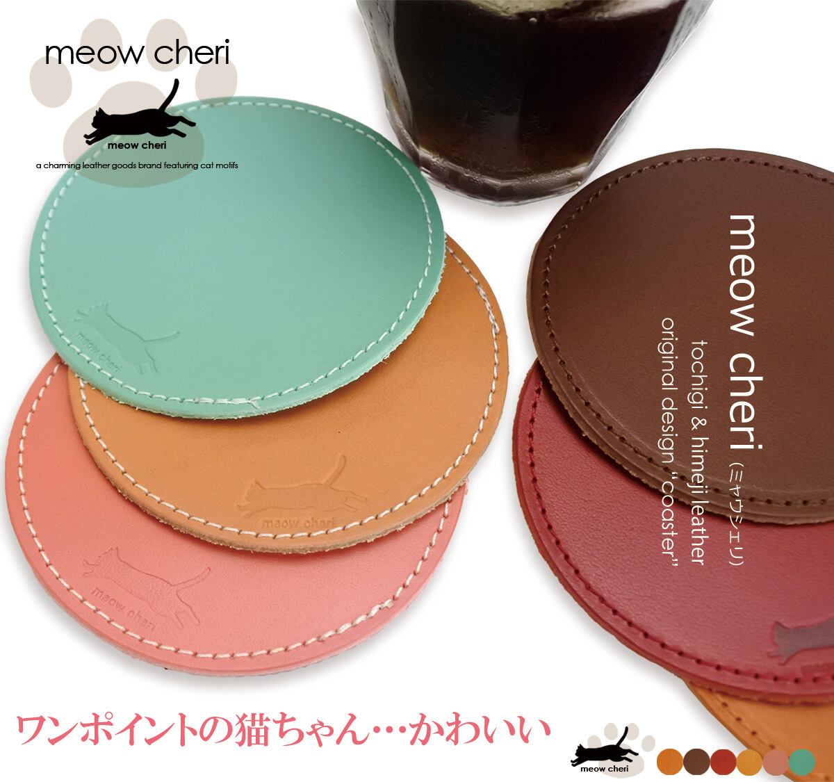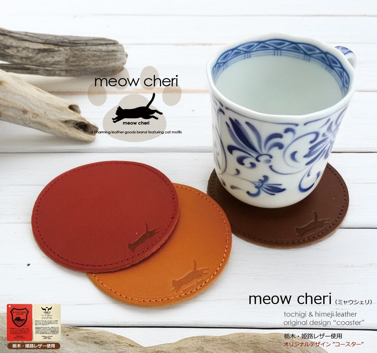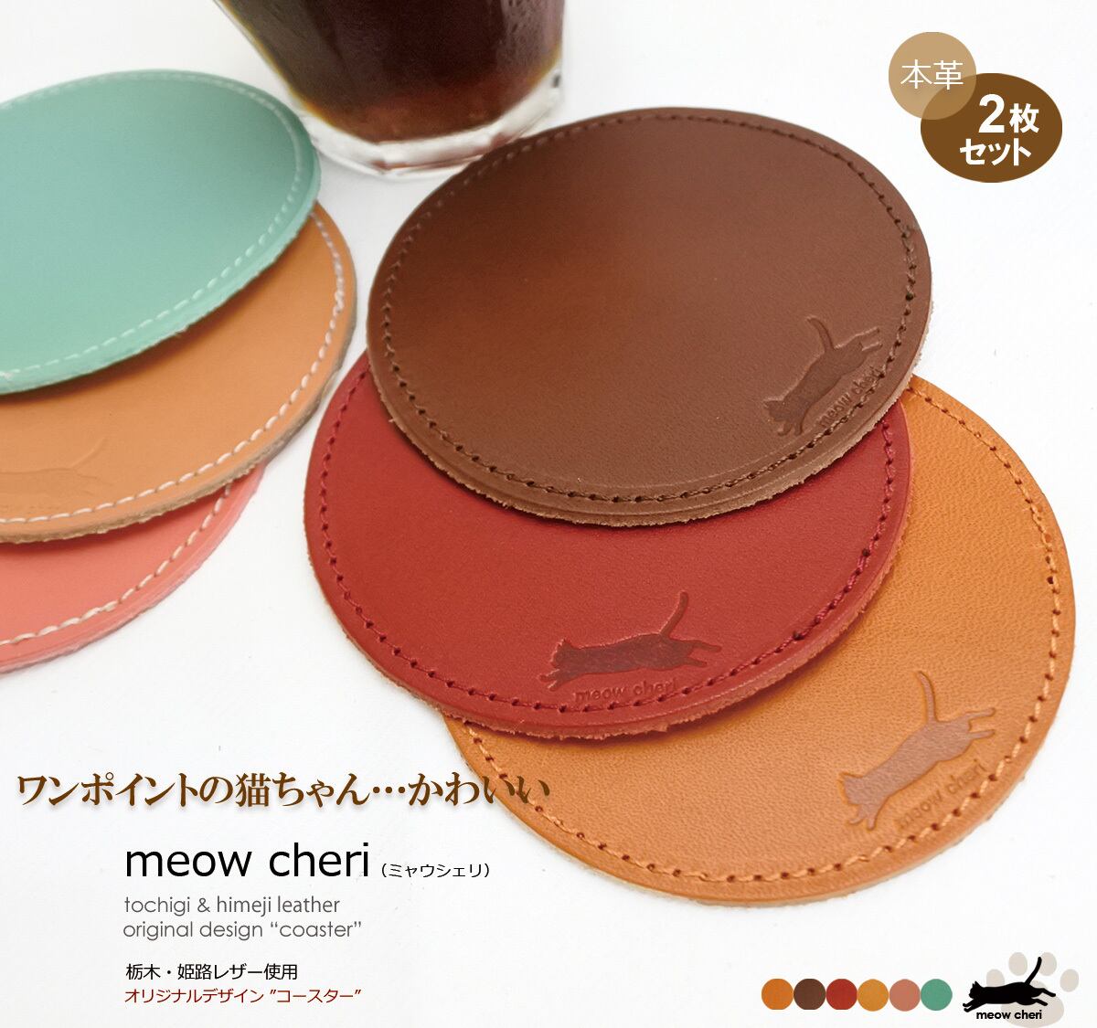 meow cheri コースター 本革 猫 2枚セット おしゃれ かわいい 栃木レザー 姫路レザー 日本製