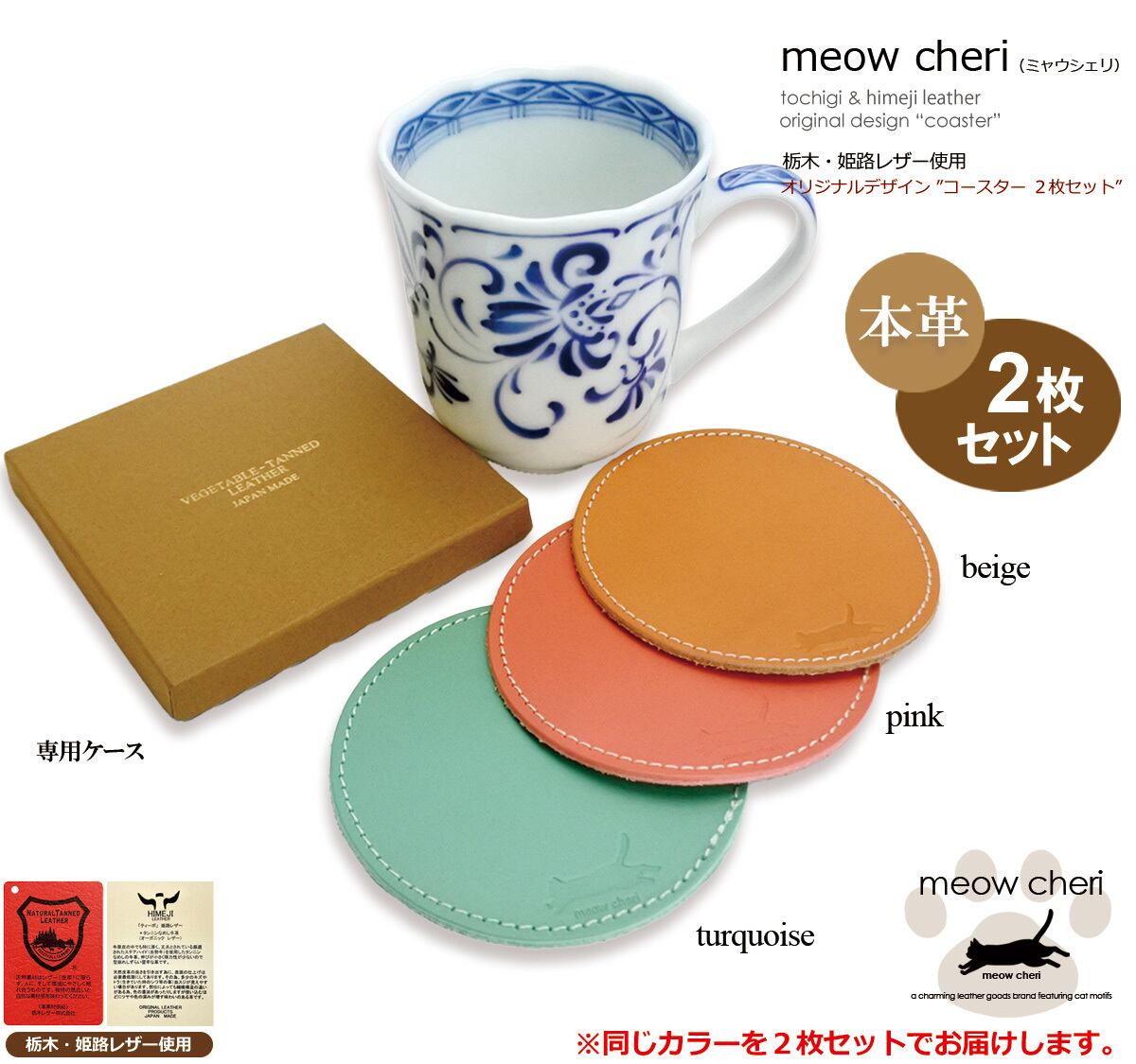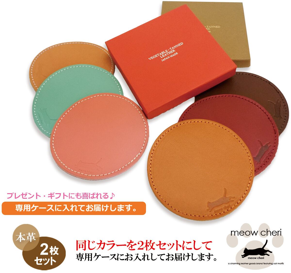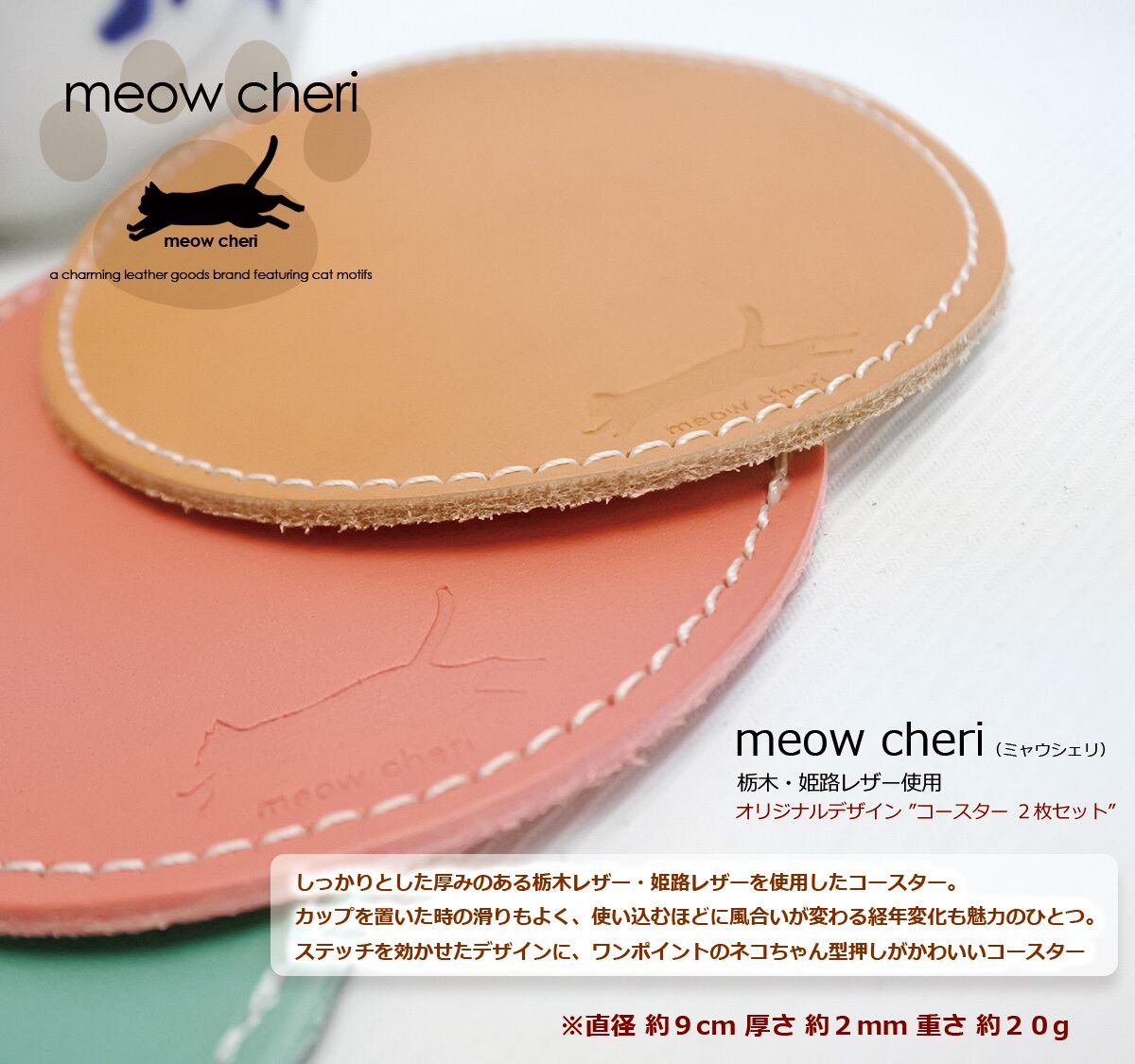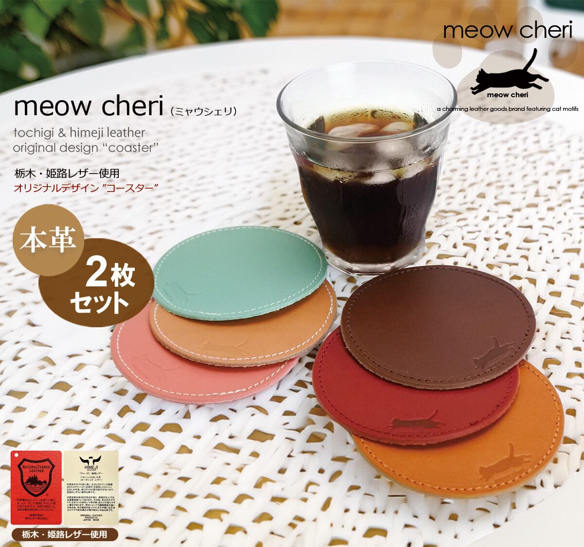 meow cheri コースター 本革 猫 2枚セット おしゃれ かわいい 栃木レザー 姫路レザー 日本製