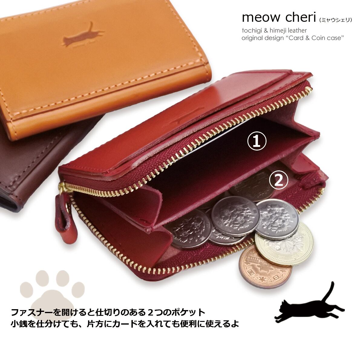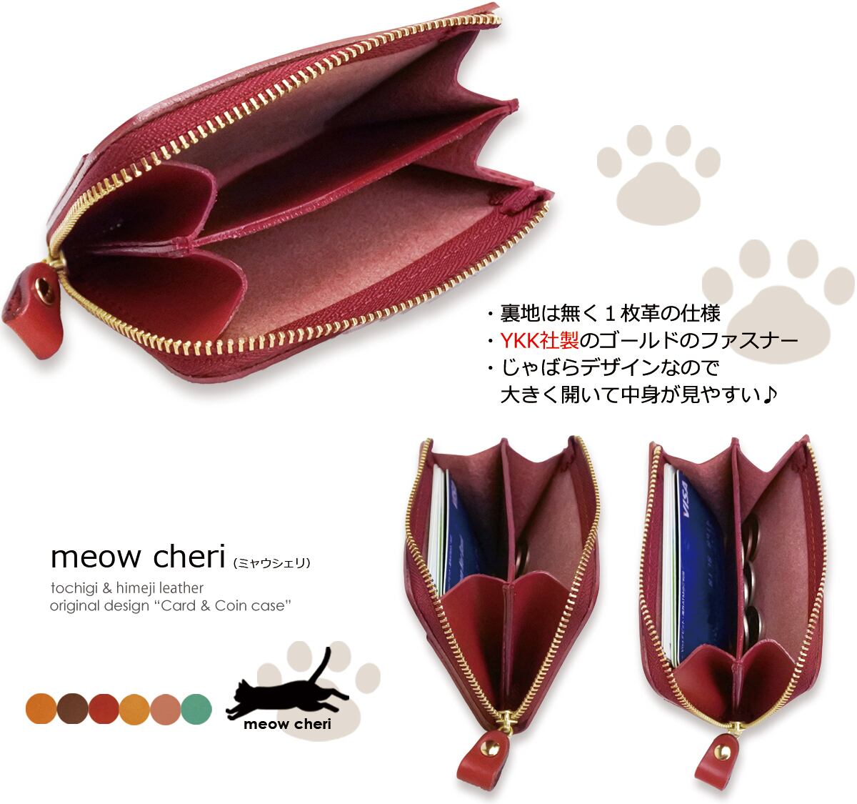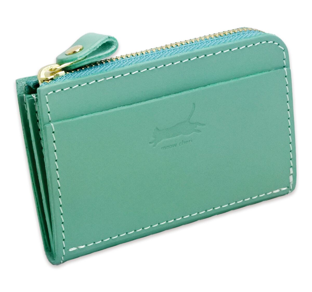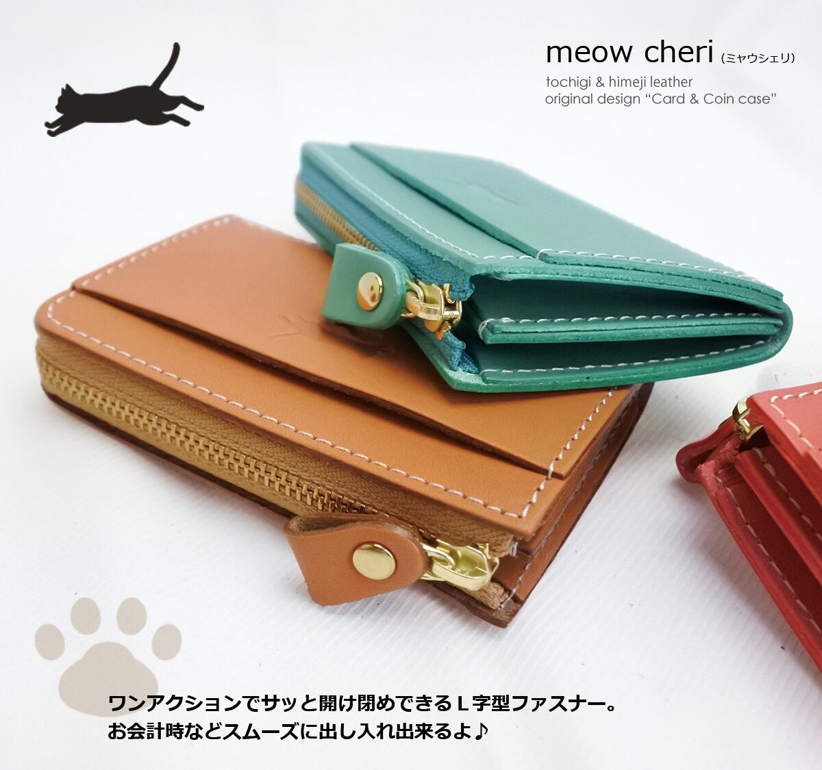 meow cheri 小銭入れ コインケース カードケース 猫 ネコ ねこ レディース 本革 日本製 L字ファスナー 栃木レザー 姫路レザー コンパクト 薄型 おしゃれ かわいい プレゼント
