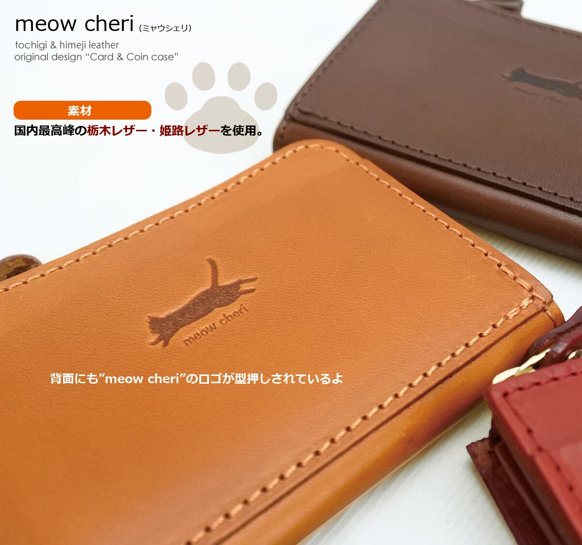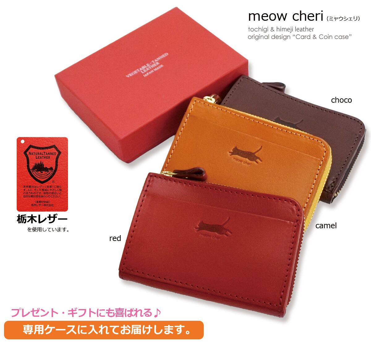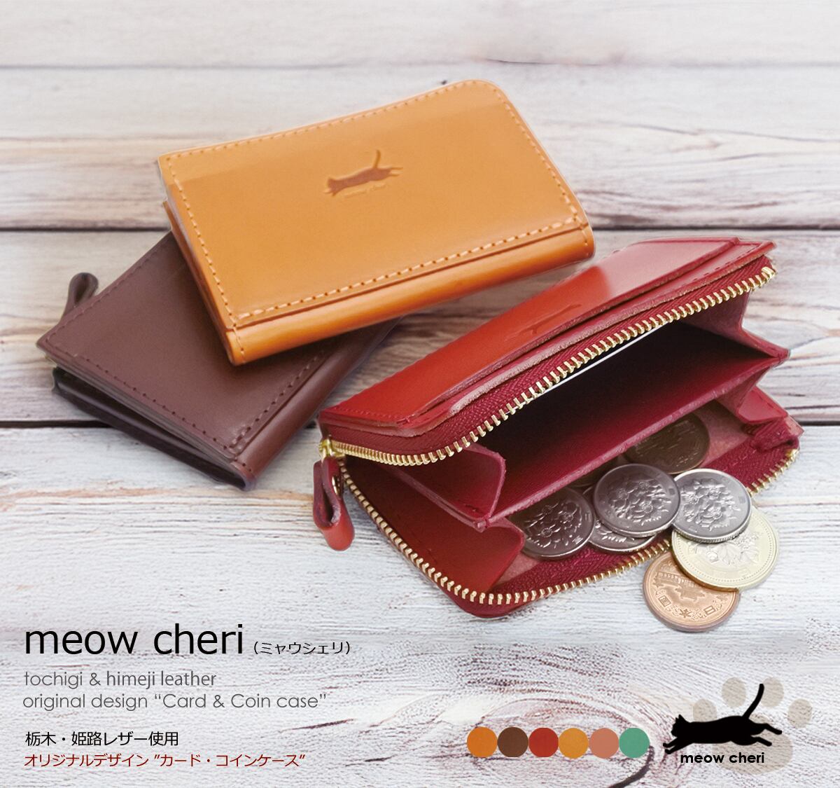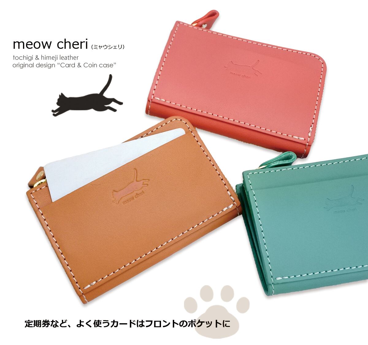 meow cheri 小銭入れ コインケース カードケース 猫 ネコ ねこ レディース 本革 日本製 L字ファスナー 栃木レザー 姫路レザー コンパクト 薄型 おしゃれ かわいい プレゼント